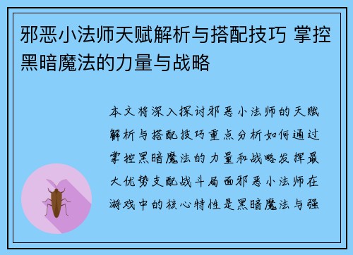 邪恶小法师天赋解析与搭配技巧 掌控黑暗魔法的力量与战略