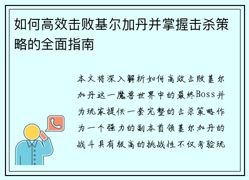 如何高效击败基尔加丹并掌握击杀策略的全面指南