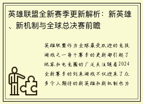 英雄联盟全新赛季更新解析:新英雄、新机制与全球总决赛前瞻