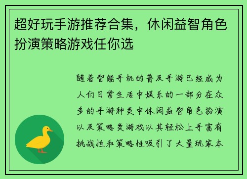 超好玩手游推荐合集,休闲益智角色扮演策略游戏任你选